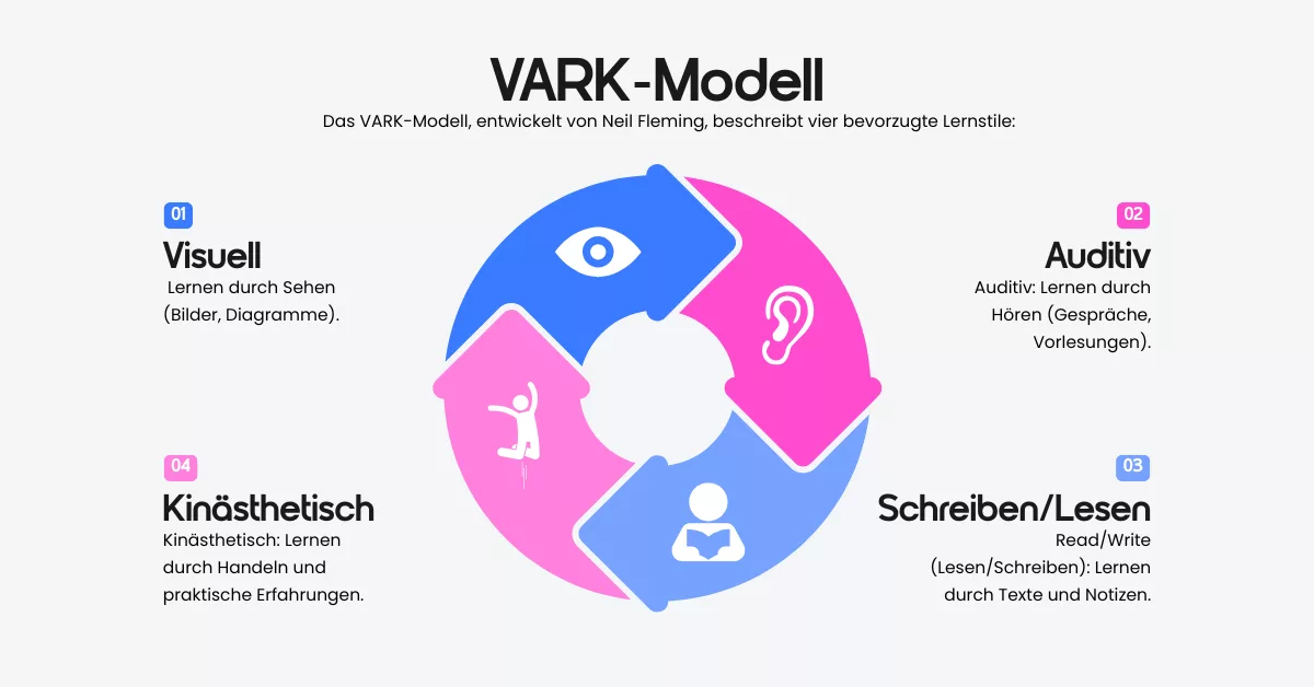 Die Lernforschung unterscheidet vier Hauptwege, wie Menschen Informationen am besten aufnehmen. Das nennt sich das VARK-Modell: